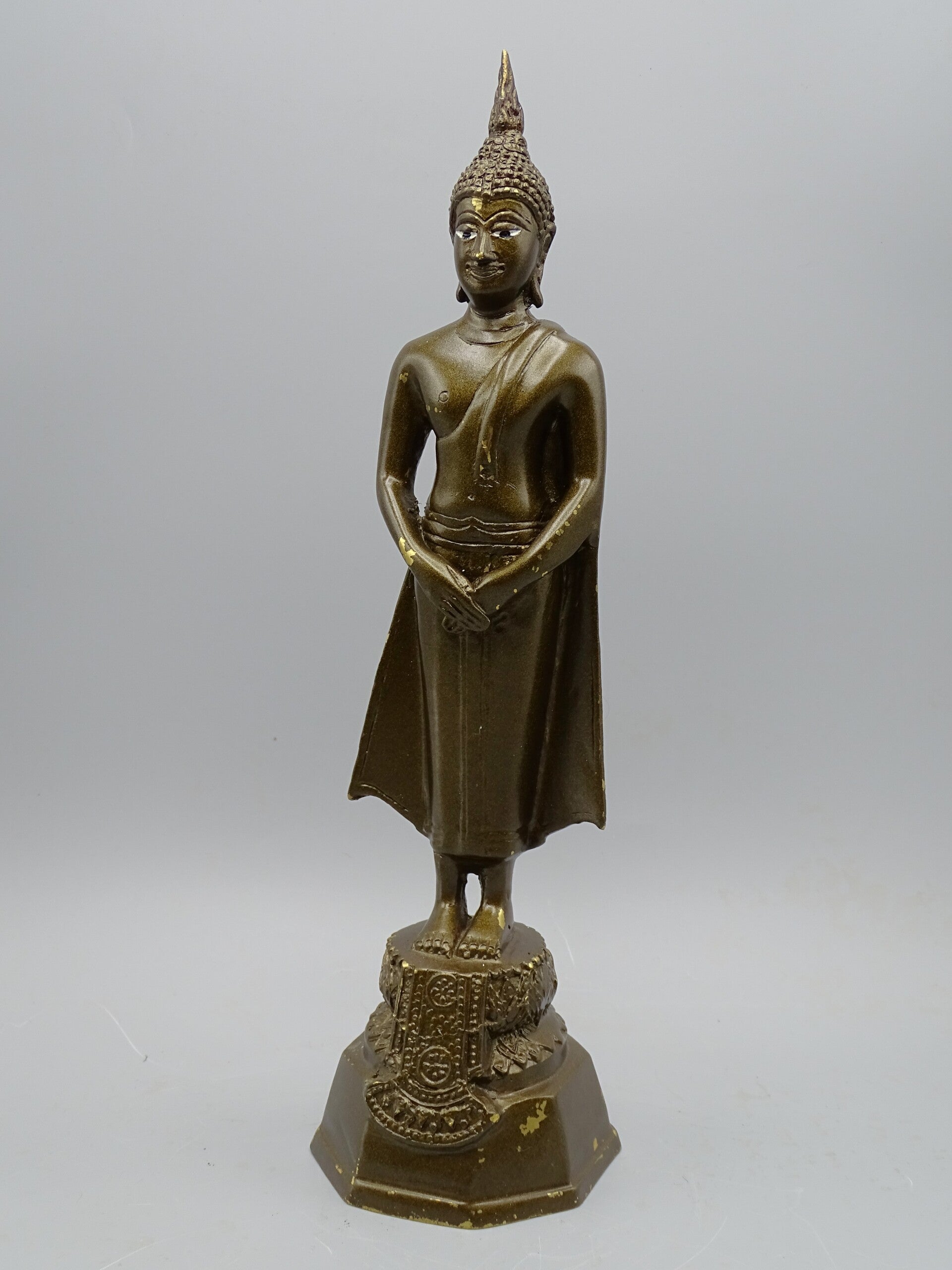 Ontdek de beschermende kracht en diepe symboliek van deze Zondag Geboortedag Boeddha. Dit beeld, met een hoogte van 32 cm, een breedte van 8,5 cm, en een diepte van 9 cm, is een prachtige toevoeging aan elke spirituele ruimte of kunstverzameling. Gemaakt van brons en afgewerkt met een donkere patina, straalt dit beeld rust en innerlijke bescherming uit. De realistisch geschilderde ogen voegen een extra dimensie van levendigheid en expressie toe aan het beeld, waardoor het nog meer tot leven komt. Hoewel het beeld enkele lichte beschadigingen in de patina heeft, benadrukt dit zijn vintage karakter en zijn herkomst uit de jaren '90. Afkomstig uit Thailand, draagt dit beeld bij aan de rijke culturele geschiedenis en spiritualiteit van de regio.